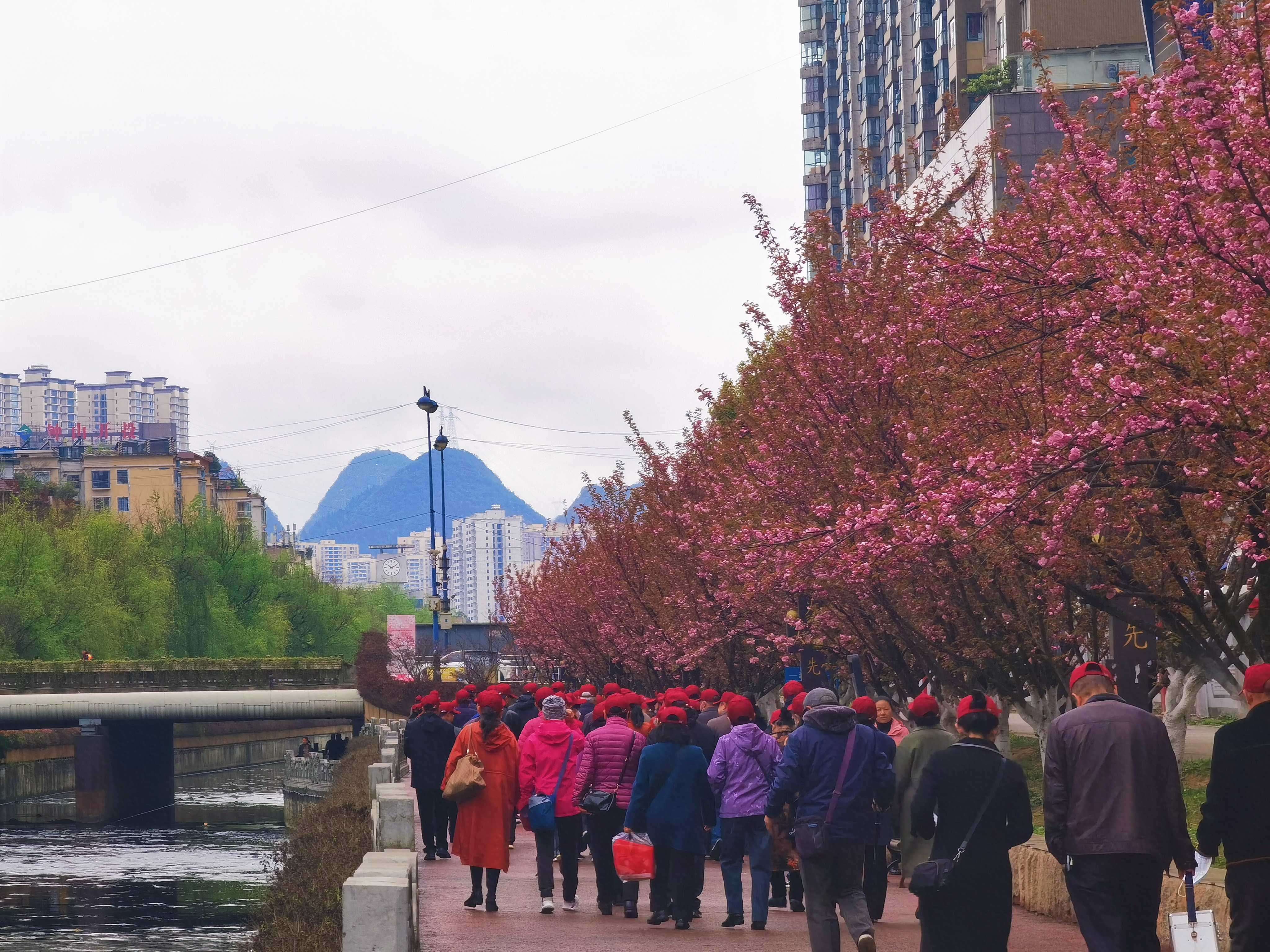 水城河畔赏樱花,笑语欢声个个夸。莫道退休人已老,初心不忘赶朝霞。